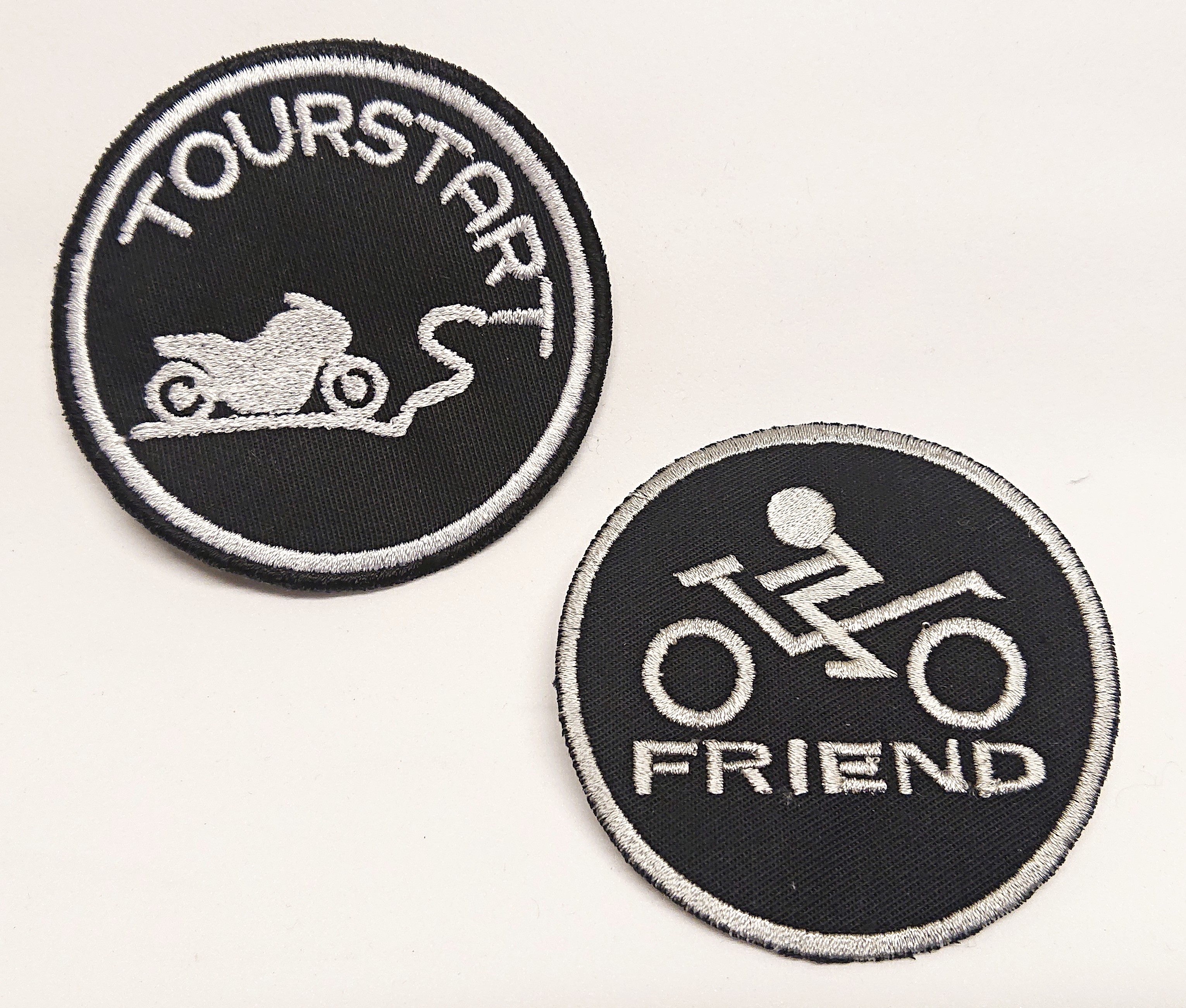 TOURSTART og Bikerfriend mærker i broderi til påsyning.